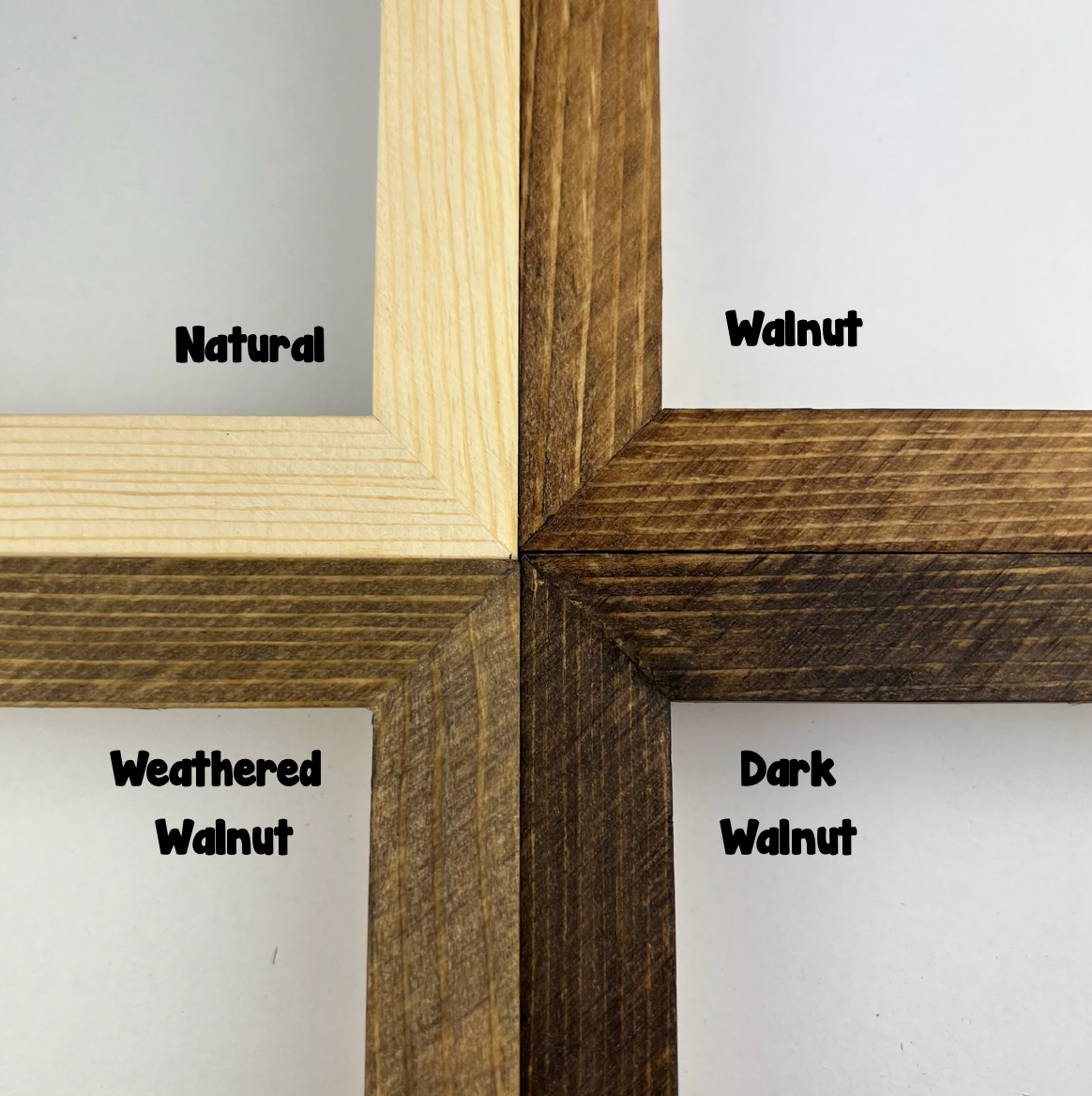 These signs have 5 options for frame finish: Walnut Stain, Weathered Walnut Stain, Dark Walnut Stain, Natural, and Black Paint.