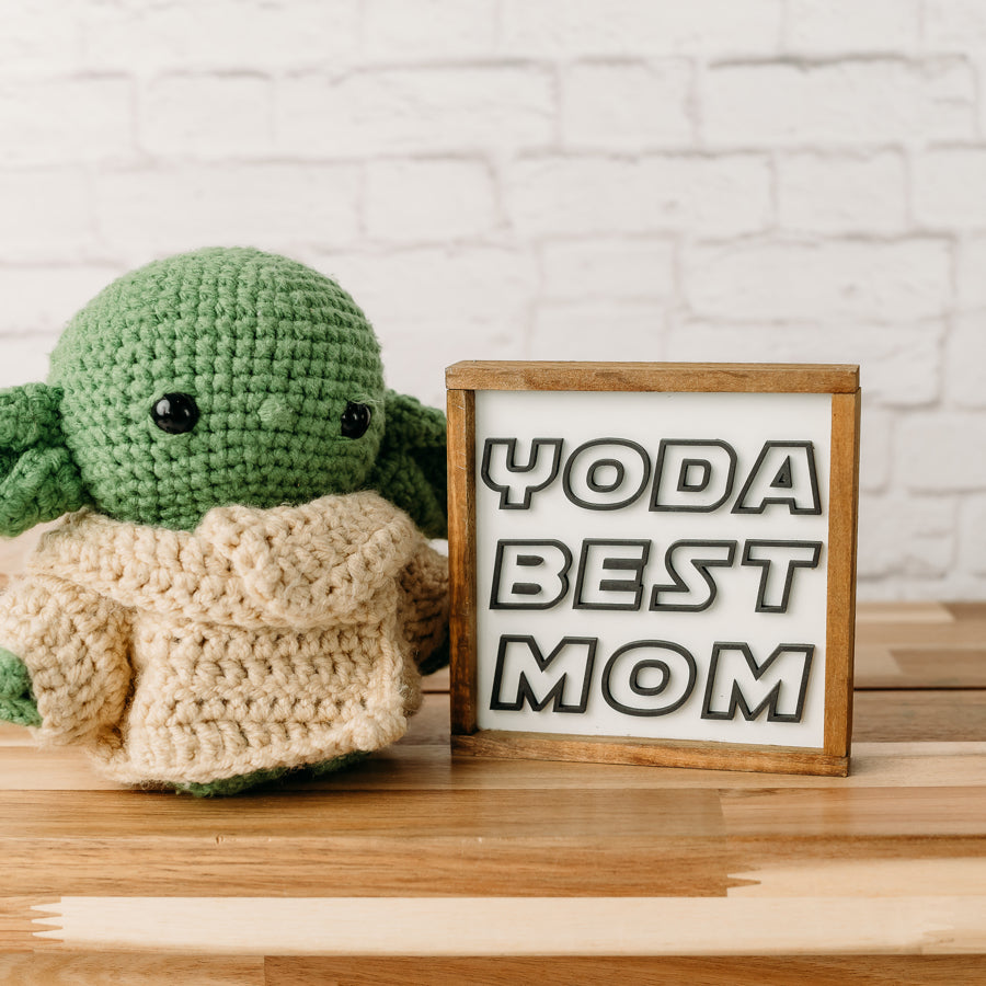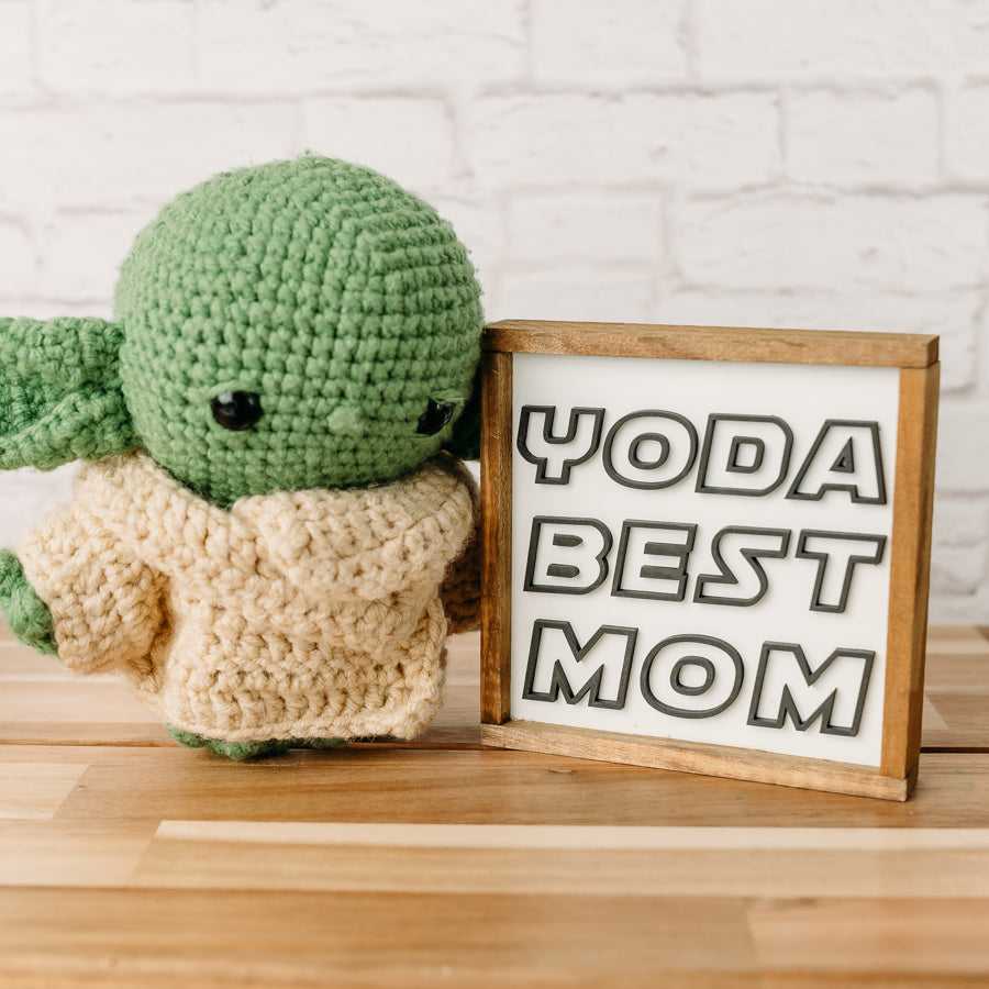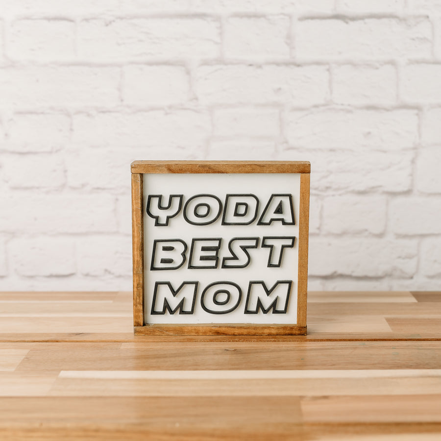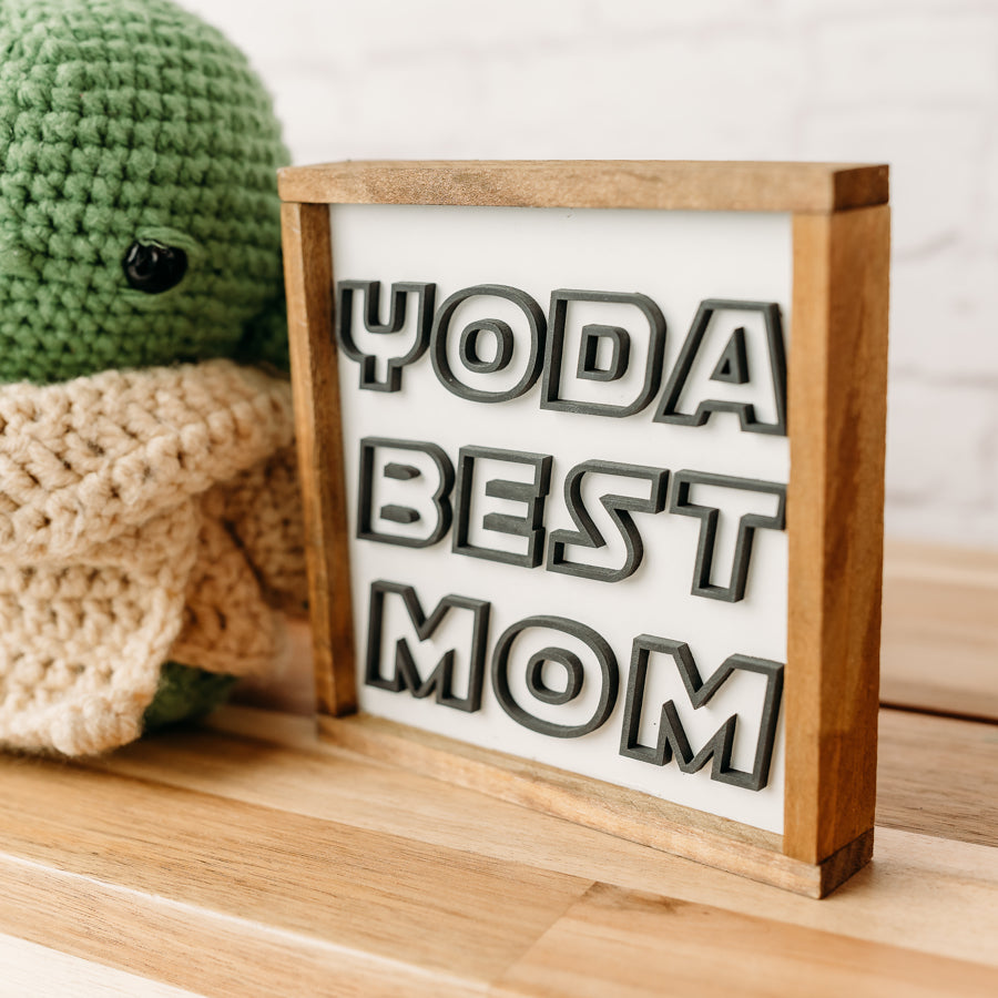 Celebrate your favorite Star Wars-loving mom with this adorable Yoda sign that delivers the perfect message: "YODA BEST MOM!" Measuring 5x5 inches, this charming piece features a stained frame that adds a rustic touch, complemented by bold black 3D lettering against a crisp white background. Its playful design makes it a delightful addition to any room, whether it's displayed on a shelf, desk, or as part of a gallery wall. This sign is not only a heartfelt gift but also a fun nod to the beloved franchise, sure to bring a smile to her face. A must-have for any Star Wars fan!
